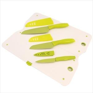 The most commonly used knives in the kitchen.5" & 6.5" Santokus perfect for precision cutting & food prep.Tough, sharp cutting blade with kullens glides through foods.High-carbon steel with non-stick resin coating.5" modified for smaller hands - popular among female chefs.4" high-carbon, resin-coated steel utility/paring knife.Hand washing recommended.Knife-friendly polypropylene cutting board folds for storing.One-handed transferring of chopped food to the pot or a bowl.13" x 16" (folds to 6.5" x 16"), Dishwasher safe. Read more...